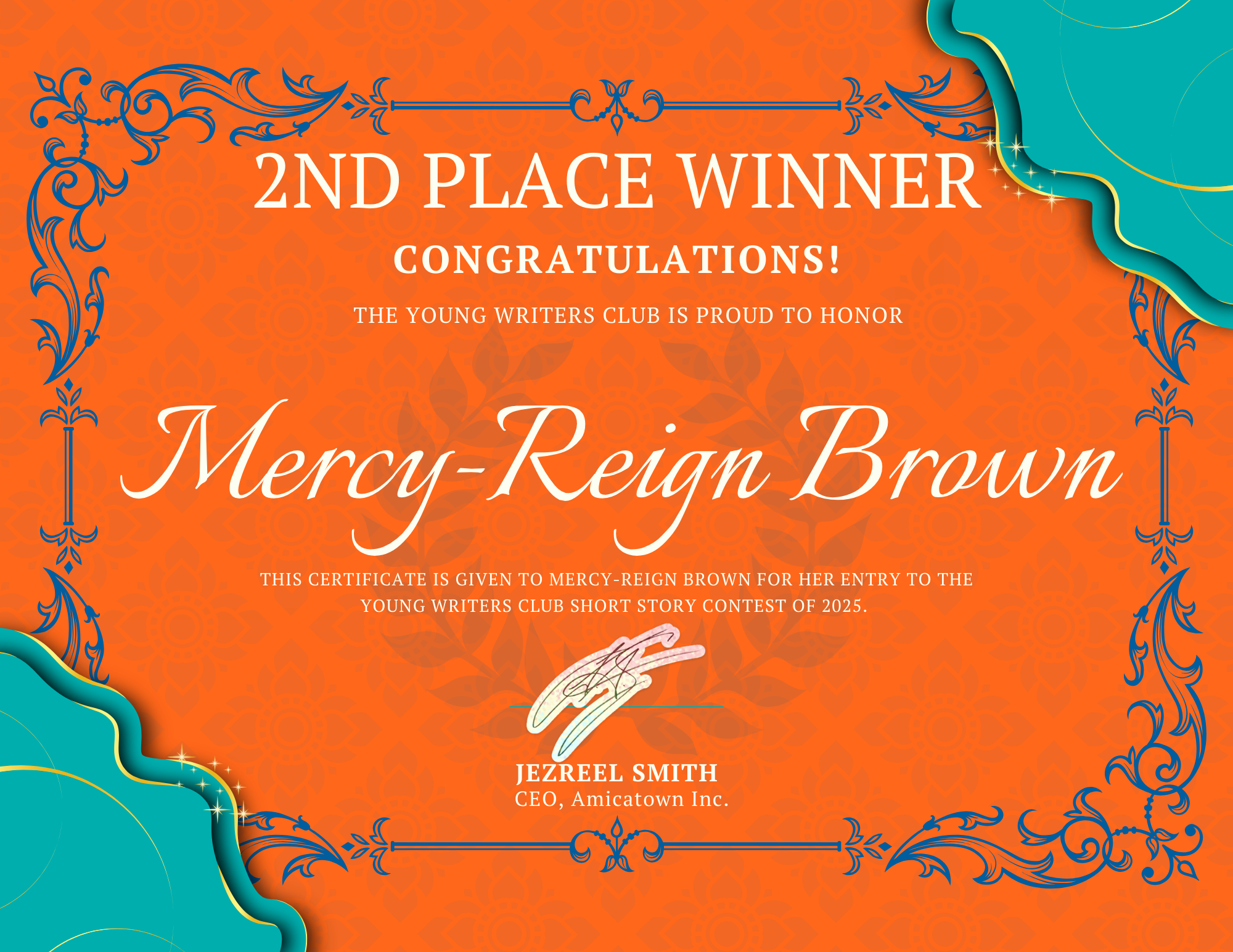 The Young Writers Club welcomes Mercy-Reign Brown as the 2nd place winner of the 2025 “Welcome to My World” Writing Contest.